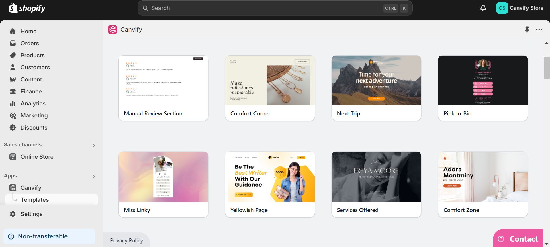 Canvify streamlines the entire process of creating a one-page scrolling website in Shopify by allowing you to design your layout in Canva and easily import it. It’s an incredibly flexible and scalable solution, enabling you to create a unique, professional-looking website without needing extensive technical skills. Plus, with Canvify’s range of templates, you can find the perfect starting point for your design, saving time and effort.